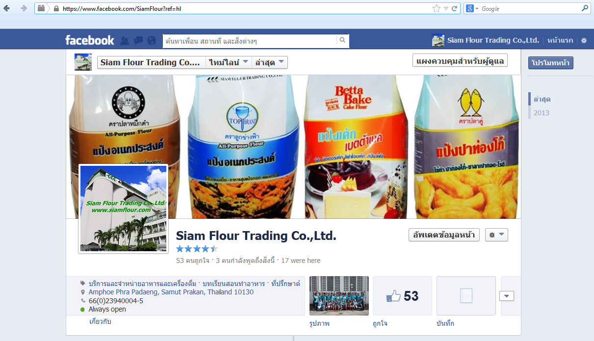 ขอเชิญทุกท่านที่สนใจเข้าร่วมเป็นส่วนหนึ่งของ Fanpage Facebook ของบริษัทฯ ค่ะ การเป็นส่วนหนึ่งของ Fanpage Facebook บริษัท สยามฟลาวค้าแป้ง จำกัด นั้น ท่านจะได้รับสิทธิพิเศษต่างๆมากมาย เช่นได้รู้ข้อมูลข่าวสารเกี่ยวกับการจัดสัมมนาเบเกอรี่ ข้อมูลเกี่ยวกับผลิตภัณฑ์ เช่นแป้งสาลี เนยเทียม และอื่นๆ นอกจากนี้ยังมีสูตรขนมที่ท่านสามารถทำตามได้ง่ายๆ และทำได้จริงให้ท่านอีกด้วย เพียงท่านเข้าไปในหน้า page ตาม Link นี้ แล้วกด Like ค่ะ